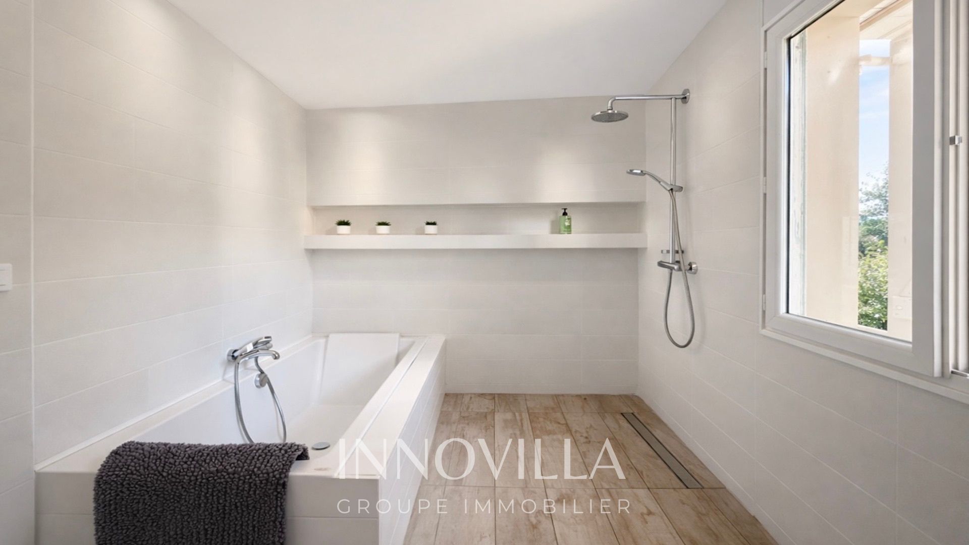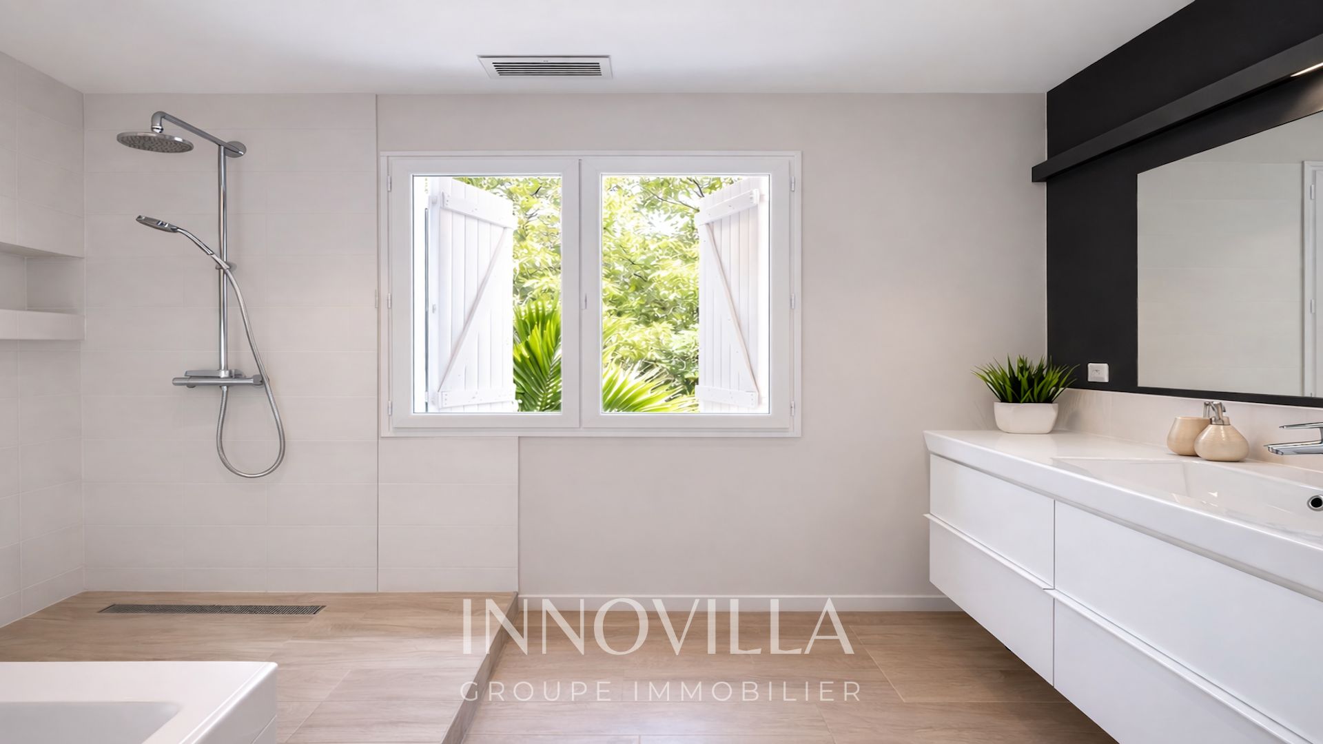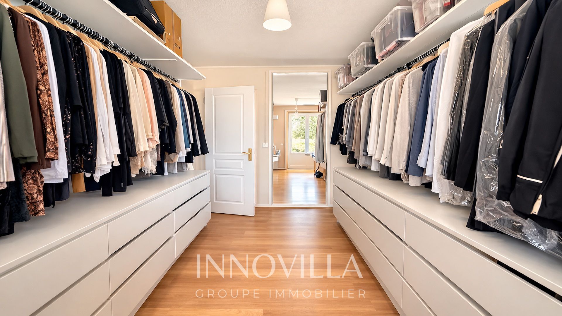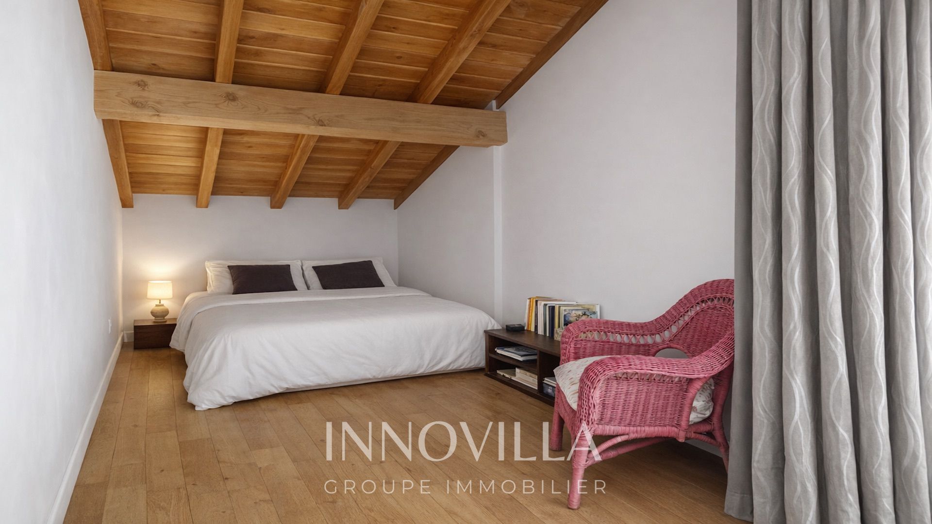 Côté nuit, on retrouve quatre belles chambres dont une actuellement aménagée en dressing. Cet espace est complété d’une salle de bain entièrement rénovée (avec douche italienne et baignoire), un coin buanderie et un wc séparé.
