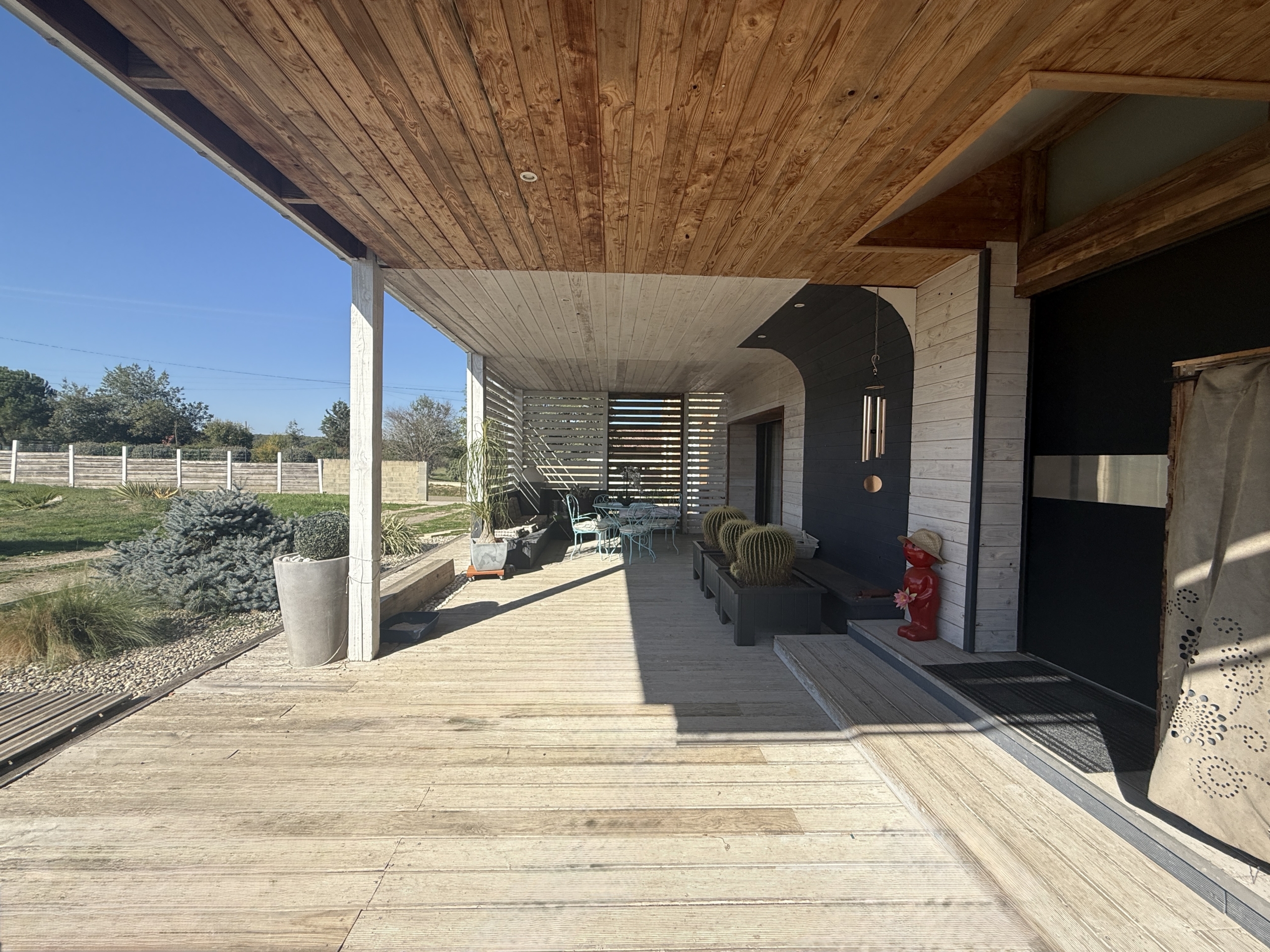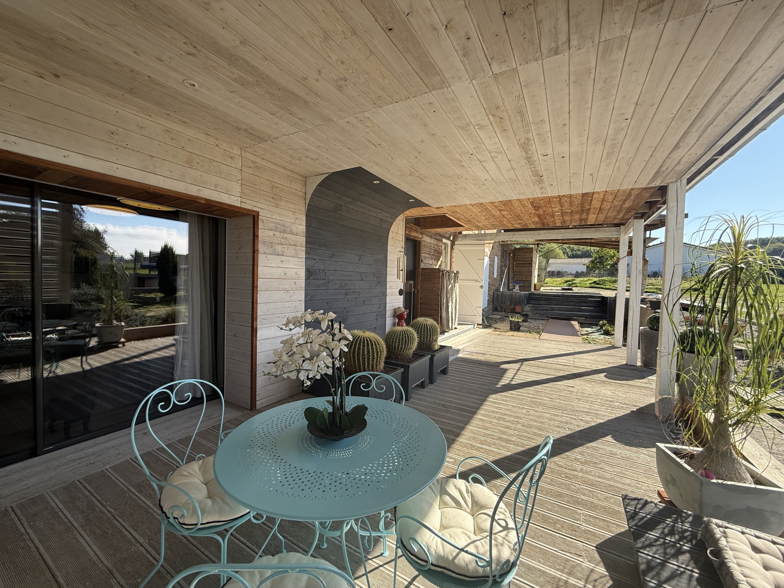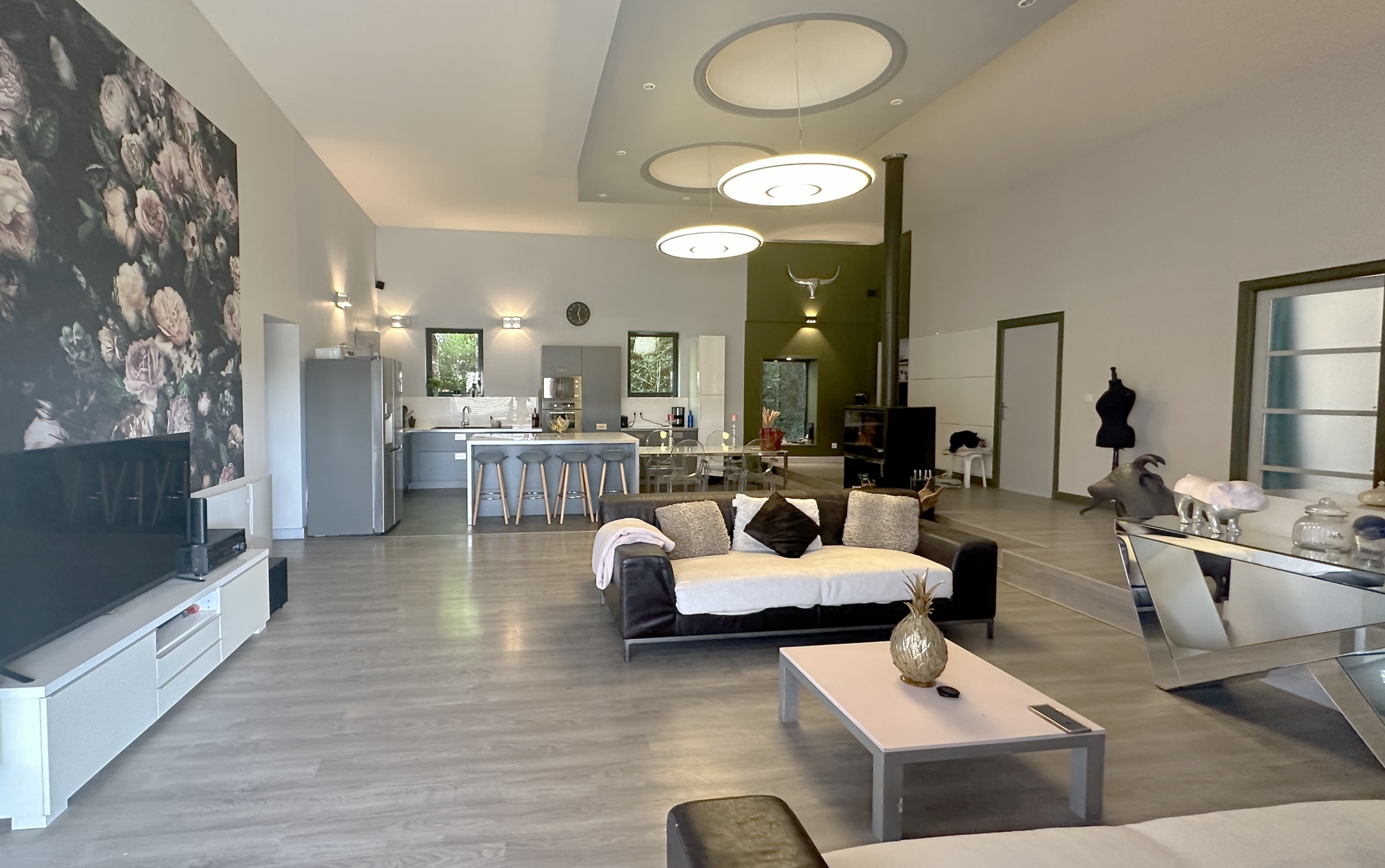 Celle-ci comprend un salon/ séjour donnant sur une terrasse en bois couverte, un coin bureau / bibliothèque, un beau poêle à bois vient agrémenter cette espace ainsi qu’une cuisine ouverte entièrement équipée et conviviale .