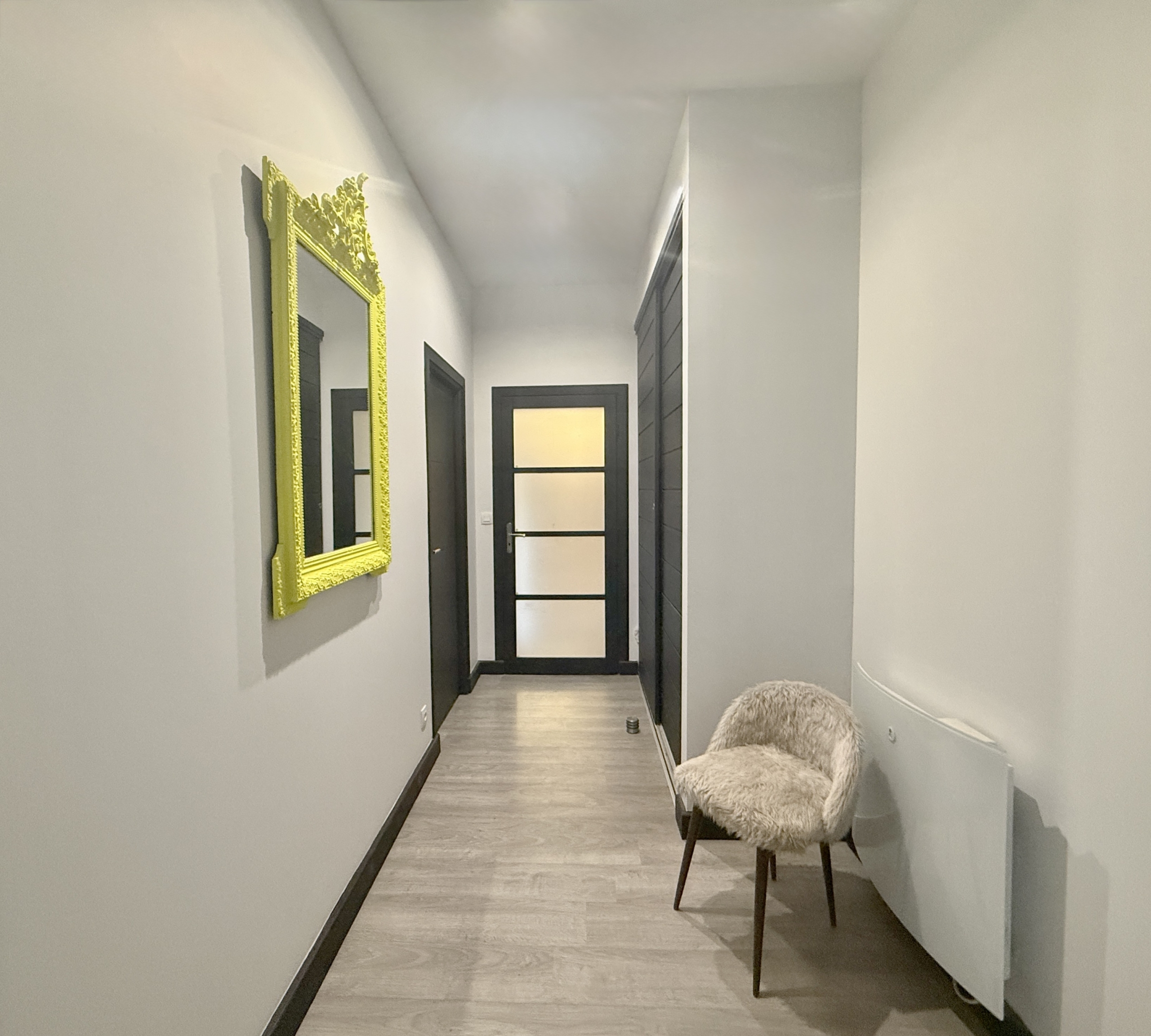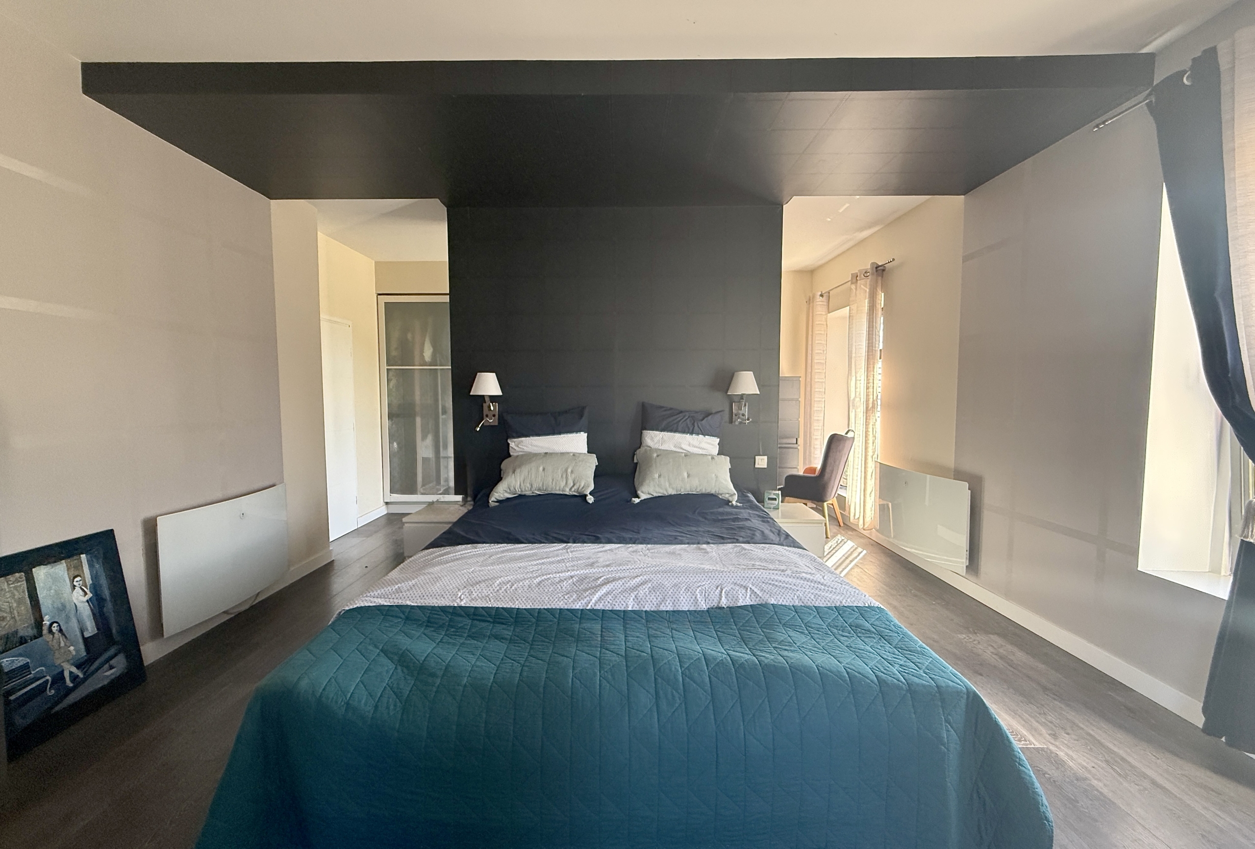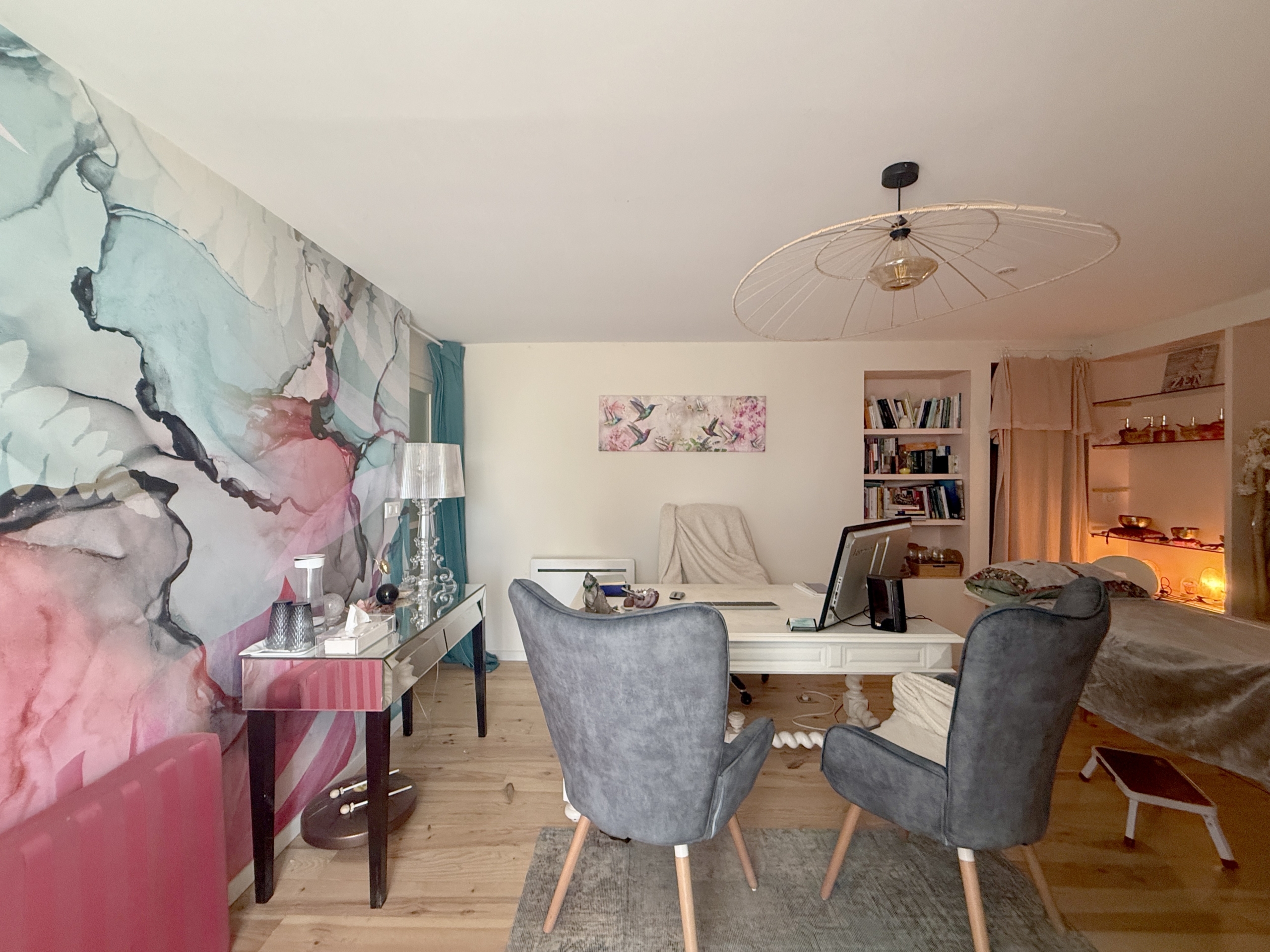 Elle se compose d’une belle entrée avec placards desservant une magnifique pièce de vie de 74m2 offrant une belle hauteur sous plafond de 3,90 m.