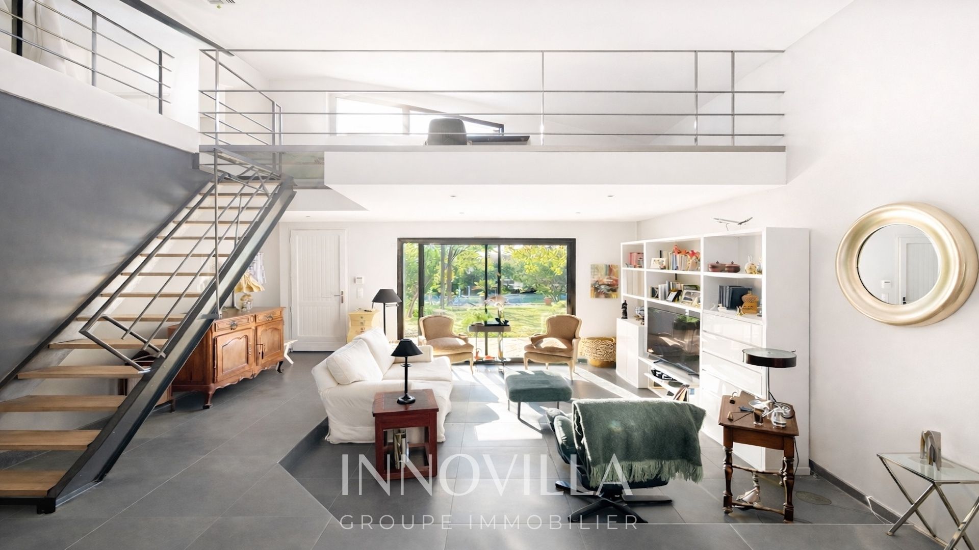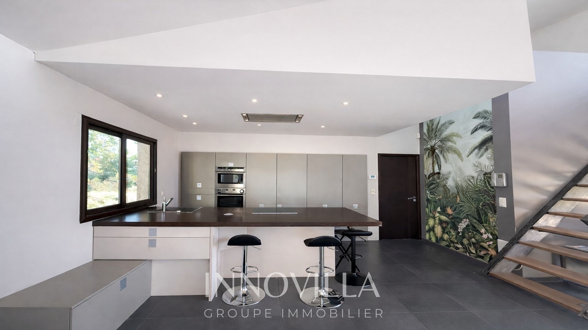 D’une surface d’environ 120 m² habitables au rez-de-chaussée, elle propose un bel espace de vie d’environ 46m2. Un séjour lumineux avec plafond cathédrale, un coin salon sur un niveau décaissé, salle à manger avec une belle cuisine équipée, complète et conviviale.