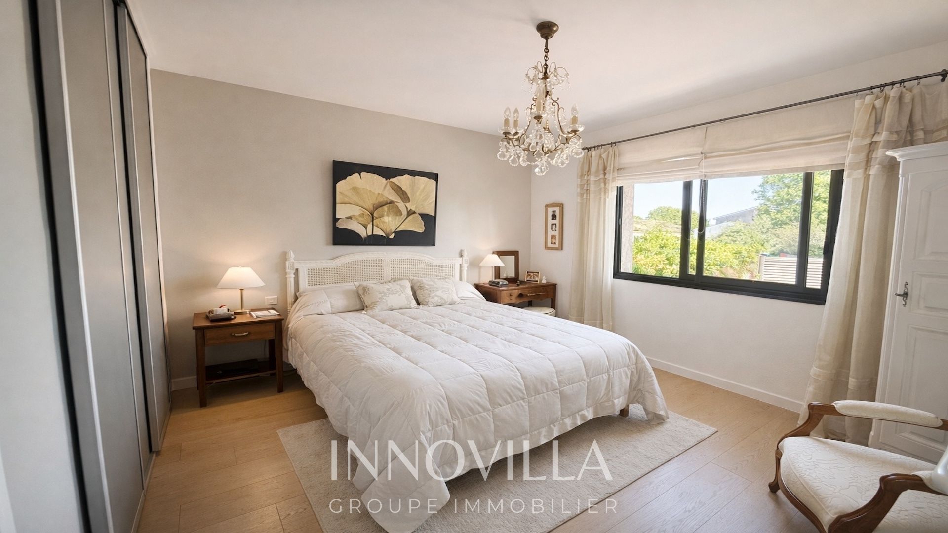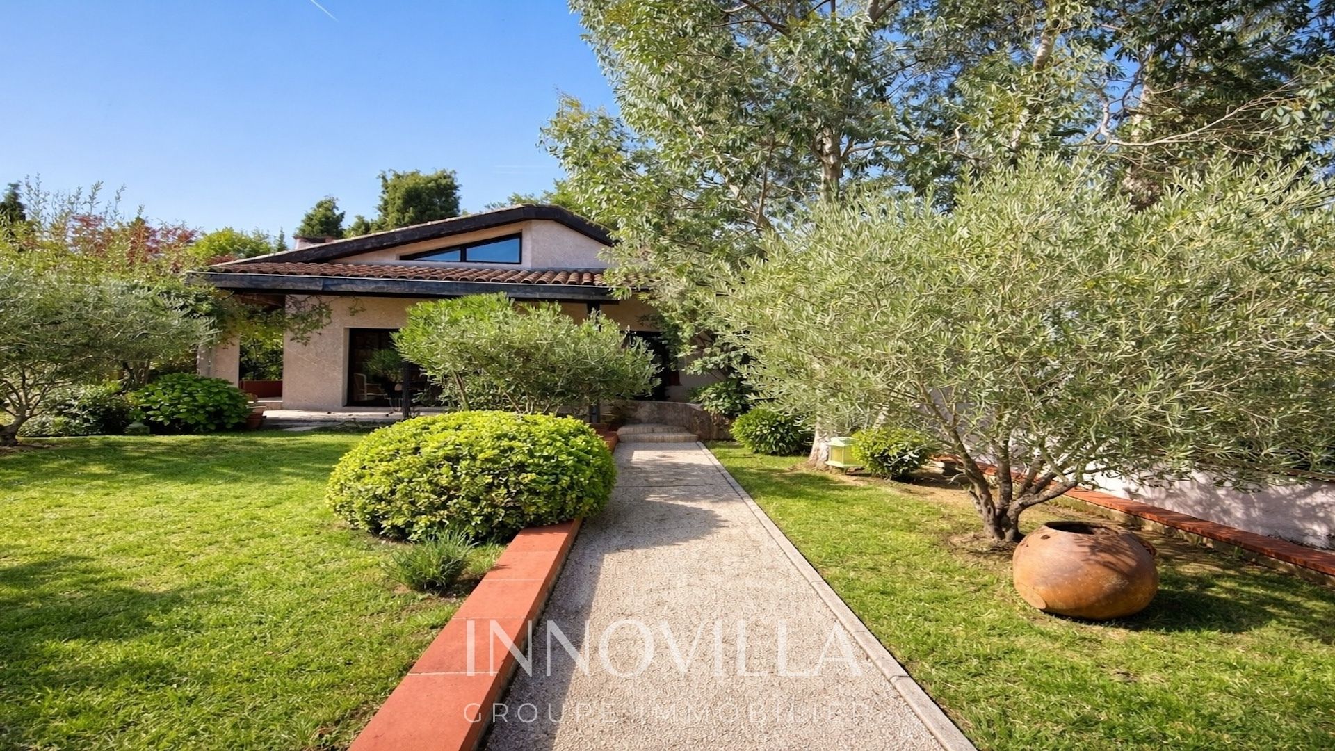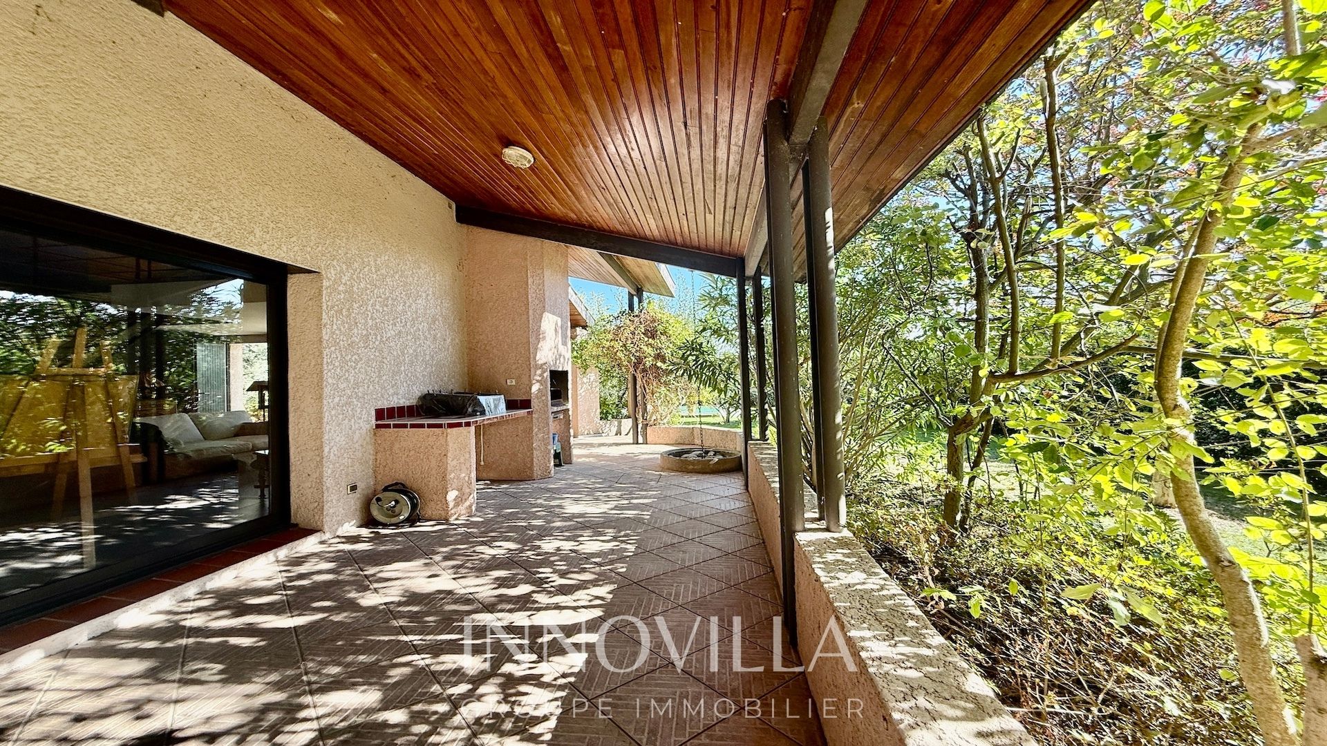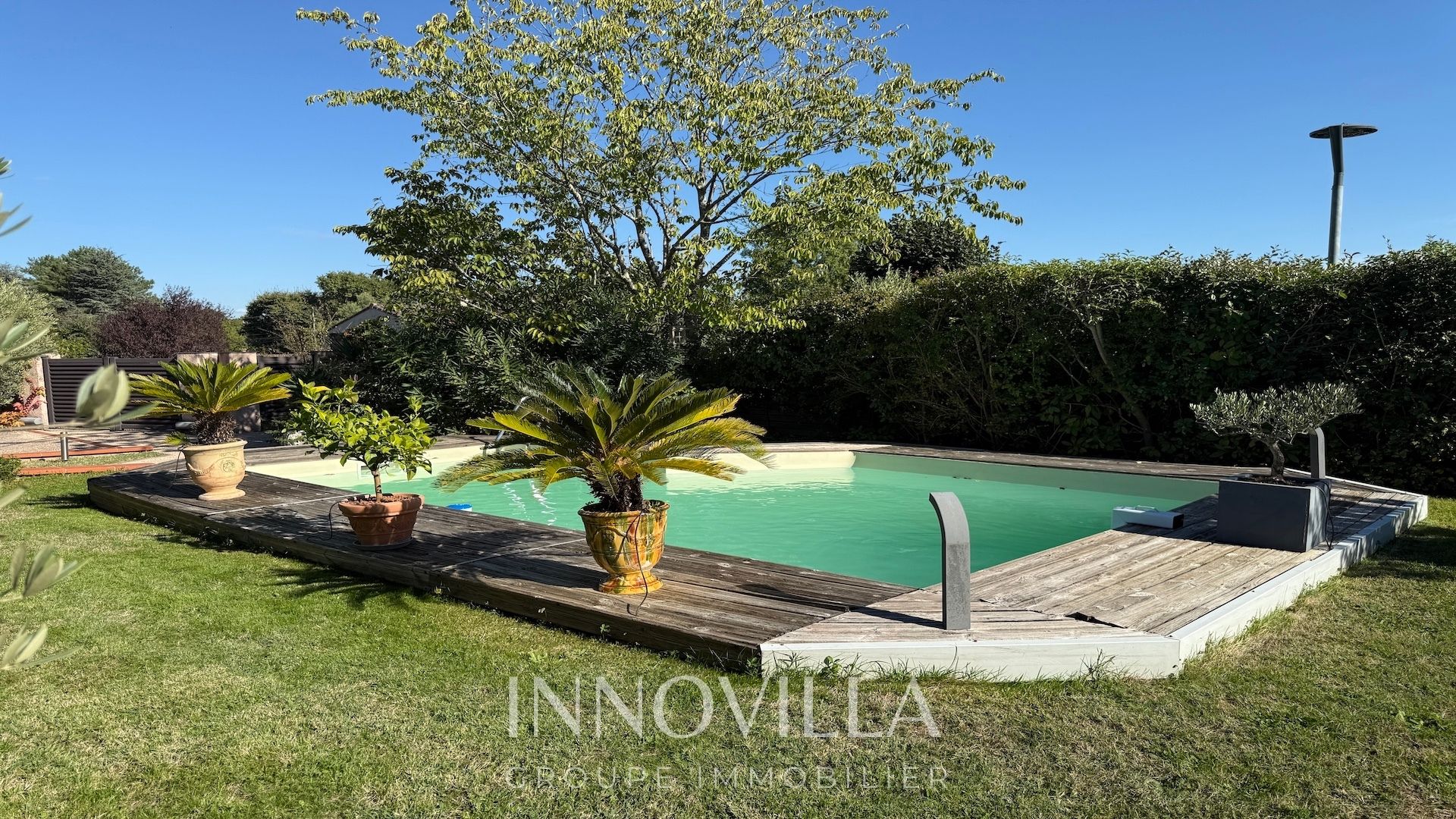 À l’extérieur, tout est pensé pour la convivialité et le bien-être. La villa est édifiée sur une parcelle de 813 m2 paysagée et entièrement clôturée. Terrasses couvertes et carrelées avec barbecue tournant autour de l’espace de vie. Piscine, jardin parfaitement arboré, terrain de pétanque, parking et allées en béton désactivé, portail motorisé.